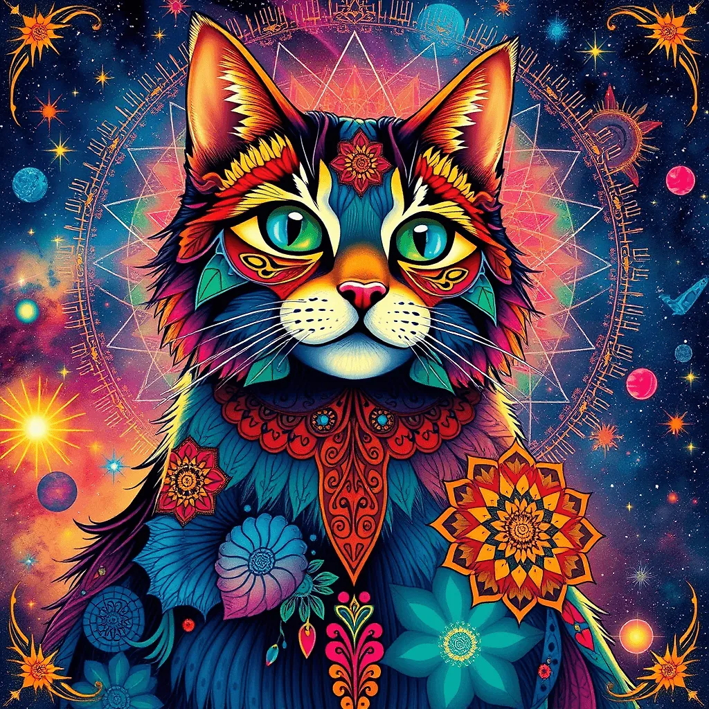 prompt: A stunningly detailed colorful cat with intricate mandala designs. The cat's fur features vibrant colors, while the mandalas are a part of the cat's fur. The background showcases a cosmic universe, with brilliant lights and geometric sacred geometry. This enchanting illustration exudes a magical aura in an Alphonse Mucha style.aspectRatio: 1:1negativePrompt: worst quality, low qualitysuperResolution: No
