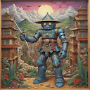 prompt: robot samurai, masquerade, Wooden stake grappling hook, striking, Crystal mountain, New moon, by Edward Hopper, PBR, Maya Model, Fisheye Lens, Paper-Mache, Electric Colors, Detailed and Intricate, Lonely, Colored Pencil, MuralaspectRatio: 1:1negativePrompt: worst quality, low qualitysuperResolution: No