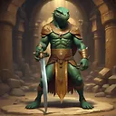 Anthropomorphic lizard warrior in Egyptian attire with swords in cavern - Fulgent AI
