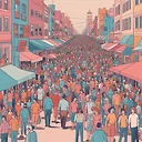 prompt: A minimalistic vibrant retro pastel illustration showcases a very crowded street festival. The illustration is designed to evoke a sense of busyness and very different people feeling lost in the crowd., illustration, cinematic, fashionaspectRatio: 1:1negativePrompt: worst quality, low qualitysuperResolution: No