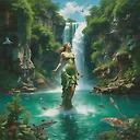 prompt: A surreal and captivating scene featuring a stone-skinned woman emerging from the water. Her upper body, adorned with lush green foliage, rises from the water like an underwater statue. A majestic waterfall cascades from her shoulder, creating a stunning visual effect as it pours into the teeming water below, inhabited by diverse marine life including fish, a dolphin, and a ray. The deep blue sky, reminiscent of an underwater or dreamlike setting, creates an enchanting atmosphere.aspectRatio: 1:1negativePrompt: worst quality, low qualitysuperResolution: No