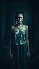 prompt: A young woman stands in a dark, gloomy room, surrounded by symbolic representations of guilt, sin and despair. The person has visible wounds and seems to be torn apart inside. In the distance you can see a light, but it is hidden by shadows. The mood of the picture should be dark, hopeless and at the same time introverted., photo, cinematic, poster, vibrantaspectRatio: 9:16negativePrompt: worst quality, low qualitysuperResolution: No